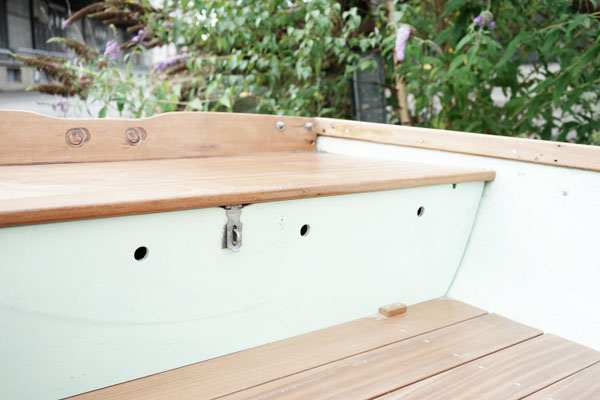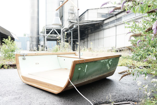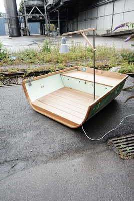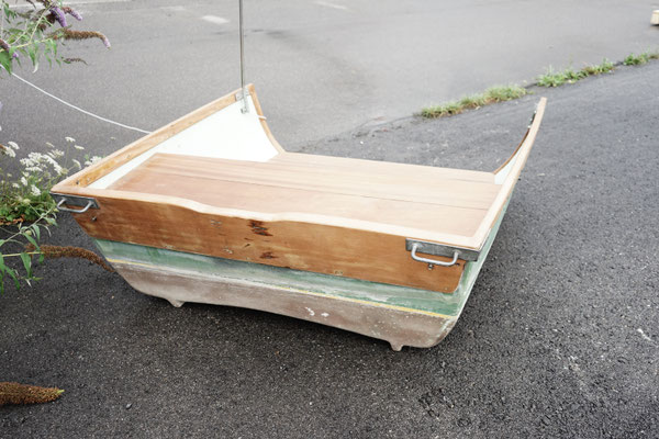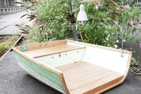 Die andere Hälfte von Enrico zeigt sich als Lounge inkl. Lampe. Aus einem echten Fischerboot der lange im Sarnersee herum fuhr. Das Boot wurde getrennt und zu einem Lieblingsstück verwandelt. Diese Lounge ist ebenfalls für den Garten geeignet, ohne Lampe